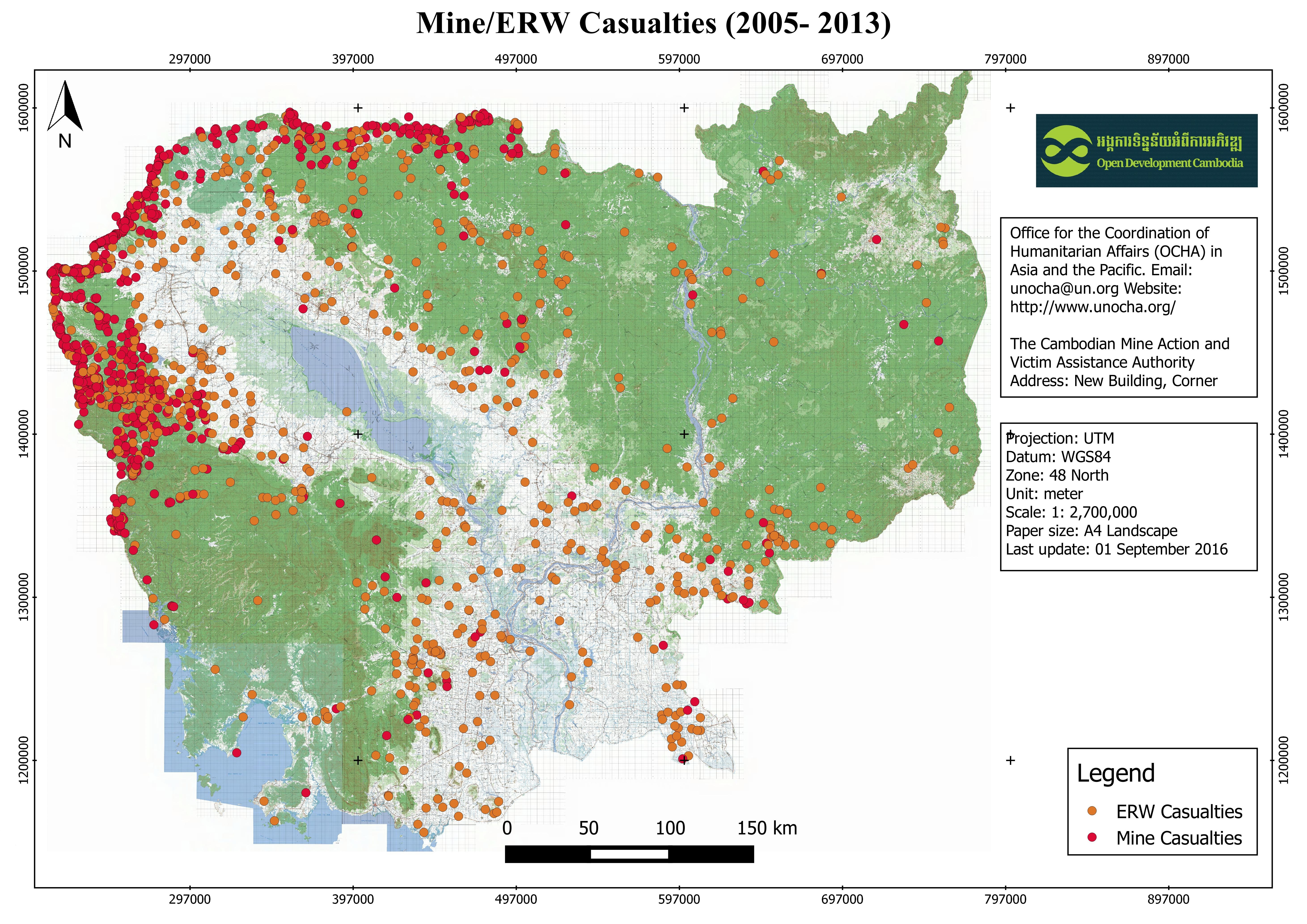 This dataset shows information about locations of casualties caused by explosive remnants of war (ERW) and mines from 2005 to 2013 across Cambodia. Plus, it also includes number of victims (injured, amputation or killed) from each explosion, as well as the types of explosions; such as mortars, artillery, fuses, anti-personal mines, anti-vehicle mines and so on. It is originally established by The Cambodia Mine/ERW Victim Information System (CMVIS) of Cambodian Mine Action and Victim Assistance Authority (CMAA), and contributed by Office for the Coordination of Humanitarian Affairs (OCHA) to Humanitarian Data Exchange (HDX). ODC's map and data team collected the data in shapefile format from HDX website and re-published it on ODC's website.